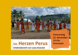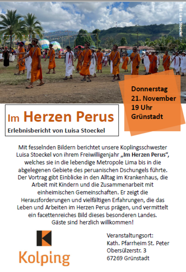 Mit fesselnden Bildern berichtet unsere Kolpingsschwester Luisa von ihrem Freiwilligenjahr " Im Herzen Perus", welches sie in die lebendige Metropole Lima bis in die abgelegenen Gebiete des peruanischen Dschungels führte. Der Vortrag gibt Einblicke in den Alltag im Krankenhaus, die Arbeit mit Kindern und die Zusammenarbeit mit einheimischen Gemeinschaften. Er zeigt die Herausforderungen und vielfältigen Erfahrungen, die das Leben und Arbeiten im Herzen Perus prägen, und vermittelt ein facettenreiches Bild dieses besonderen Landes. Gäste sind herzlich willkommen!