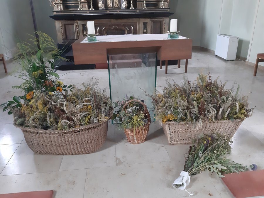 Nach einem alten Brauch sammelten anlässlich des Hochfestes Mariä Himmelfahrt fleißige Helfer aus Sausenheim, Neuleiningen und Kirchheim Kräuter, banden sie zu Würzwischen und gaben diese gesegnet, gegen eine Spende für unser Indien-Engagement ab. In diesem Jahr haben wir an verschiedenen Plätzen gesammelt und im Hofe der BrauArt gebunden: Kamille, Färberkamille, Lavendel, Goldrute, Schafgarbe, Johanniskraut, Wiesen-Bocksbart, Frauenmantel, Zitronenmelisse, Bohnenkraut, Pfefferminze, Thymian, Estragon, Natternkopf, Wiesen-Sauerampfer, Wegwarte, Weiße Melde, Dost (wilder Oregano), Beifuß, Fenchel, Wiesenknopf, Eisenkraut, Ysop, Wilde Möhre, Klee, Schleierkraut, Borretsch, Muskatellersalbei, Flockenblume, Rainfarn, Frauenlein, Hafer, Gerste, Roggen,Weizen, Eberraute, Kardendistel, Königskerze, Rosmarin, Salbei, Blut-Weiderich.