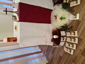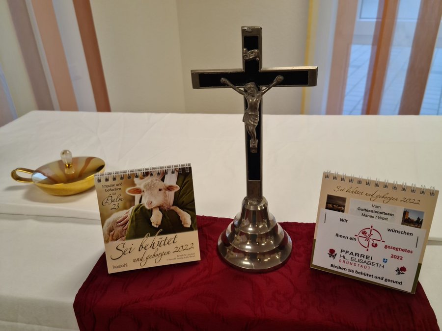Die Kalender waren nicht nur auf und um den Altar schön dekoriert sondern wurden danach an die Gottesdienstteilnehmer und alle anderen Bewohner des Haus Maximilian verteilt. So sind alle Bewohner das ganze Jahr über mit Psalm 23 behütet und geborgen.